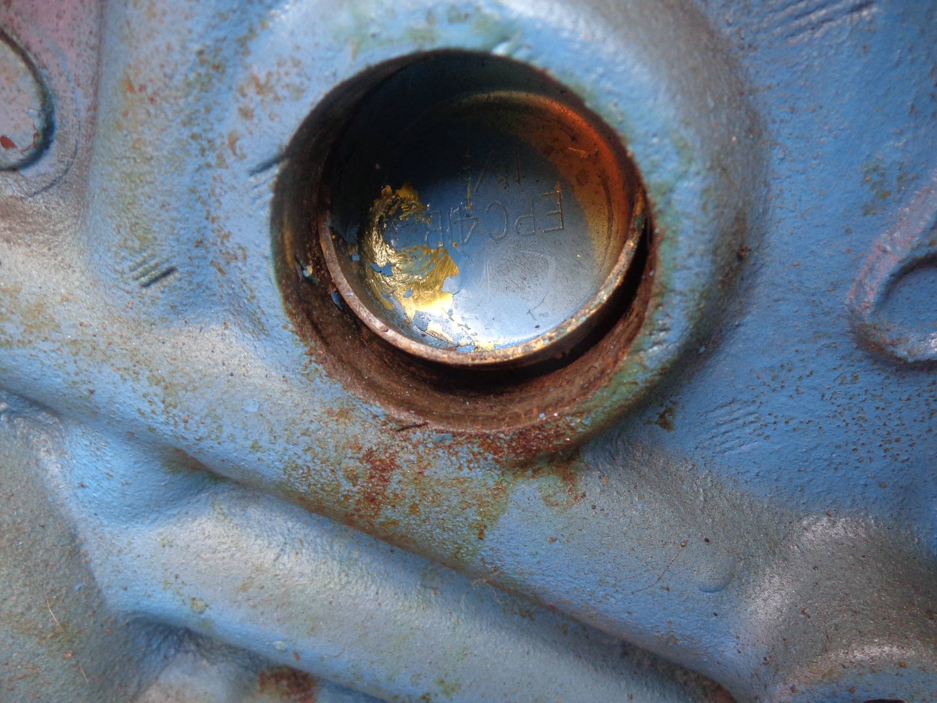 If someone ever worked on your block and replaced the timing chain cover there is a potential for damage... If they used a bolt that was too long shown in the pictures below it can crack the front face of the block into the water jacket and/or damage the #1 cylinder bore by cracking it or distorting it from excessive force when using a too long bolt and torquing it... Look through the core plug and look for witness marks on the #1 cylinder sleeve for witness marks if a too long of a bolt was used, there will be a mark on the outside of the cylinder... If there is a witness mark on the cylinder, inspect the front face of the block and look for any cracks like shown in the pictures below... If you find any cracks or damage, it would be best to scrap the block and find another one...
