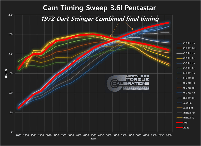 Once we have the resultant HP/Trq curves the final WOT cam timing is dialed in by taking the "best" results through out the entire RPM range.