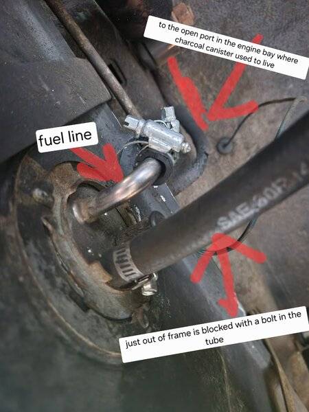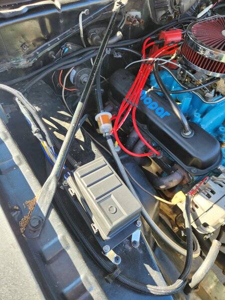 First time poster here. I just bought this Dart a month ago, and it was my first experience with old American cars. I've fixed a lot of small things with the help of the search button on this site, but I'm running into a problem and I can't find what I need without posting. This is a 1975 dart, with a 360, and I've got a fuel boiling problem. I started with an electric fuel pump install, this helped but didn't completely solve the issue. Which is, whenever I'm stopped in traffic or make a quick stop at the store, and fuel is sitting in the lines, not moving, I'll take off again and I get a massive stumbling problem. Before the electric pump, the fuel filter would be essentially empty all the time when it was hot, now it is filled up a bit more, but I still have stumbling issues when I park for a few minutes then go back and drive. I think the electric fuel pump helps keep it under pressure so it doesn't vaporize in traffic, but obviously can't do that when I'm parked. So now I'm looking into adding one of the wix filters with a third outlet to lead back to the tank, so the vapors can escape if and when they build up. My charcoal canister is long gone and I have an open port up in the engine bay. I feel like I've read conflicting reports if I can use this as a return. Can I just plumb that third nipple of the filter back into the line that used to go to the charcoal canister and add a vented gas cap? I don't see why not, as long as I can find a gas cap that vents under pressure and vacuum, does one exist? I also don't know what kind of fuel sender I have in the tank, because one port is completely blocked off and I'm not sure what it was originally for? I could use rubber line to connect the blocked port to the hardline that goes up front, and use some rubber line to direct the "original" vent to atmosphere. Or vice-versa, or use a vented cap if I can find one. I'd appreciate any advice, this ain't a race car or a show car, I just want to drive my dodge with the dog and not have annoying stumbling problems. Thanks yall! I added some pics of my fuel sender, the fuel pump install that is running through a relay box and fuses, which is all running through a circuit breaker, and a pic of the dog that just wants to go to the park.