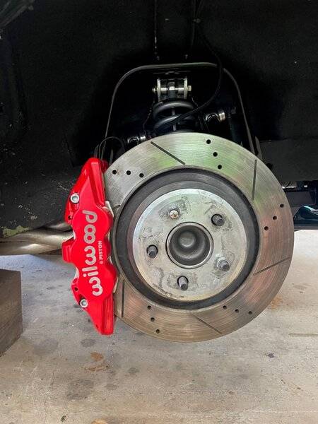 The spindle/hub assembly you see below is a drop in for the Mustang 2, but uses a C5/C6 corvette hub and brake configuration. I didn't have enough GM parts on my car, so I chose this over the standard M2 spindle. My wheels wouldn't work with the standard C5 brakes since the rotor and caliper are extremely close to the face of the hub. Converting to the radial mount Wilwood allows for lots of adjustment. I was able to shim the bracket very easily to accommodate the brake rotors I was previously using.