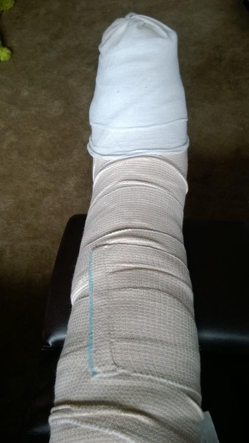 SHEESH!! First I thought you were going to look like Frankenstein. Now you're on the way to looking like he Mummy! I've heard that one of the worst things to think about is whether or not it itches under the cast, so I won't ask. - Hope it all went well.