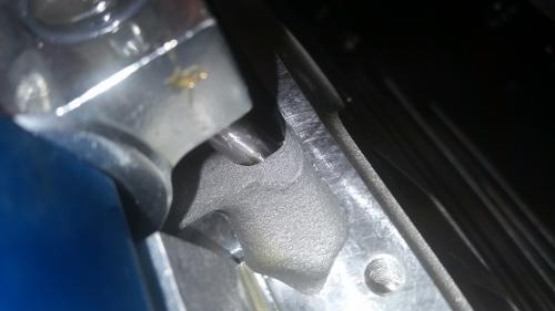 After receiving the heads from Chuck's Speed Center here in Phoenix AZ. I proceeded to give them a good soapy bath to remove any residual dirt, oil, etc.. After rinsing them, I used the blower to dry them off and a nice big piece of aluminum blew out of one of the water ports! It is pictured and appears to be from the factory. Perhaps from the process of milling the ports? Good thing I had Chuck's check the heads. All of the valve guides needed opened up to proper clearances. All of them were too tight! Never trust a set of box stock heads. Not even for general street use. Chuck' also milled .010 off the heads to bump compression per our request and back cut the valves. After cleaning the heads and drying them off, I completed shimming the Hughes double springs to their recommended installed height of 1.880 of which some required as little as .030 and most required .090 worth of shims not including spring seats!