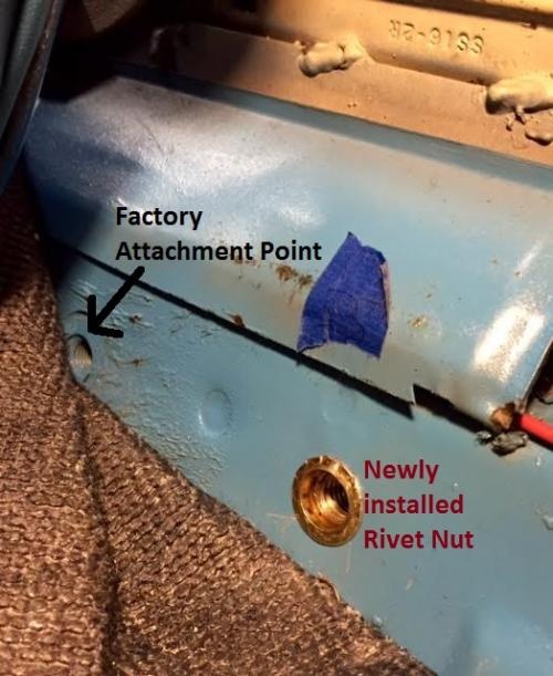 The retractor mechanism is fairly bulky, and would not fit in the factory hole down by the floor, so a rivet-nut went in the proper spot a few inches aft, on each side (photo below). The chosen spot still allows the front seat to slide fully aft, and doesnt get in the way of a rear passengers footwell, either.