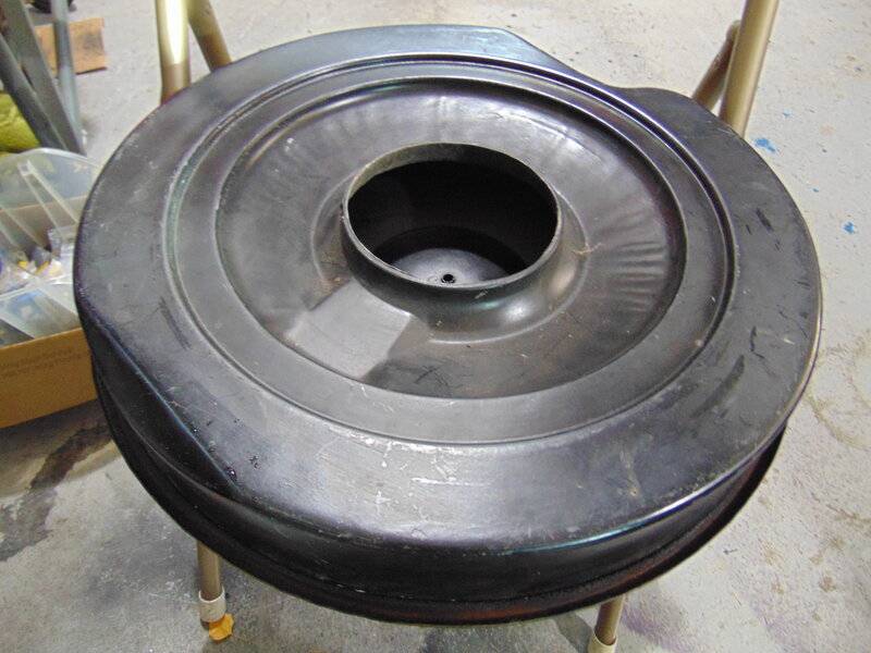 All involved in a 1000 point restoration please leave this thread now! For the rest of us, finding a 1970-1 340 air cleaner mean either taking out a loan or nursing a rusted trashed version back to usability. A decade or more age somebody was making fiberglass bases for these things and I ended up with one in a parts swap. They used to be sold through Year One and others. They look good on the out side and a nice coat of wrinkle finish paint on this and the metal top that comes with it would make a nice addition to a 70-1 340 car that wasn't a concours restoration. I would bet that 95% of the folks looking at a show wouldn't know. I would put some sort of gel coat on the inside to make it smooth. There is no 90 degree elbow for a valve cover breather but the correct location is marked in the fiberglass and could be easily faked in. Base and original metal lid for $175 plus shipping.