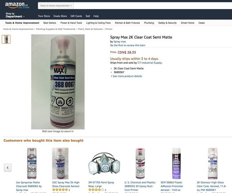 But I'm going to suggest, and this is the product I would use myself if I did this at home, a product call SPRAY MAX, in this case Spray Max 2K Clear Coat Semi Matte (not the straight Matte version). This is a two component clear so it has a hardener capsule inside the can that you pierce by putting the red cap you see in the lid on a pin on the bottom of the can and slamming it down to drive that pin into the hardener activating the clear. You have 24 hours to use the clear then it will be spent and won't spray anymore. These cans spray very nicely almost as good as a minijet spray gun but one should do a few test sprays on something and this will also show you how quickly it dries and it cures up pretty quickly which is perfect for home spraying. Now this is a professional product so most bodyshop supply stores should carry it but you can buy it on Amazon.ca and our U.S. members can definitely get it on their Amazon. It will work perfectly on fibreglass all you need to do is provide the proper sand scratch for it too grab onto like all paints. I used some degreaser first then a red Scotch brite pad since they work great for getting into all the nooks and crannies then I wet sanded the boxes with 800 grit then blow off and degrease before tag ragging the surface (use a nylon lint free tack rag if possible). If you get some of the fibreglass fibres standing up let the clear dry for a few hours then degrease then re-scuff with 800 grit (you won't need to rescuff every corner since the clear will stick to itself without sanding within 24 hours but you should degrease which removes an invisible film that most clears produce while curing) too knock them off then degrease and tack off and re-clear, this procedure should give you the same finish that I achieved.