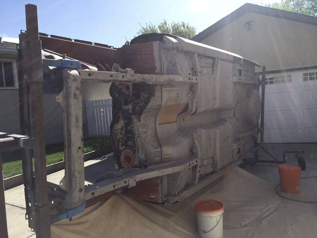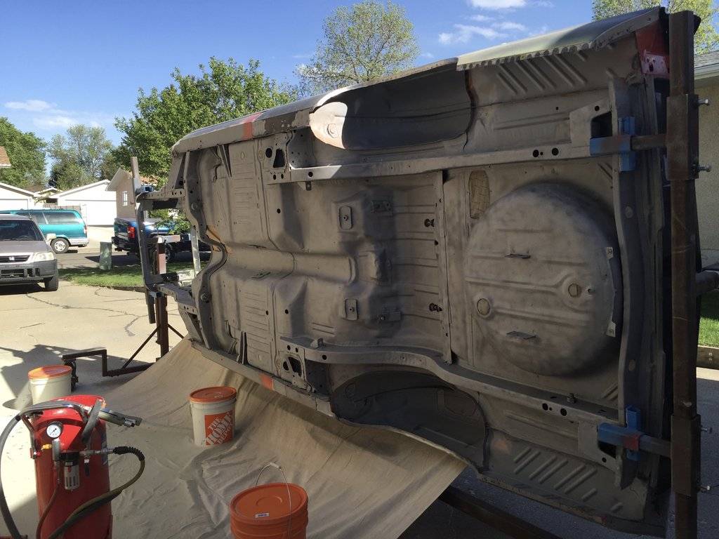 Sorry that my thread and pictures are messed up Jim, I took the approach of not wanting to spin this thing back and forth so I hung a canvas tarp off the car so it would catch most of the glass so I could easily gather it up and reuse it. Then I worked from the bottom up and blasted everything I could see at that end of the car then moved the tarp down and did that end, spun the car around and flipped it and did the same process from the opposite angle, I did wire brush it by hand to knock the bulk off before I started. I took some breaks to give my compressor a chance to cool off and me as well. I decided to remove my torque boxes and rebuild them to remove the dents and clean up the poor welding the factory did bonus being I could blast and paint the inside of them. Later I decided to blast the engine compartment and fender aprons, since I was this deep might as well keep digging LOL! I think I managed to blast the whole car using 3 or 4 bags of glass, not a fun job but the only way to clean it up right.