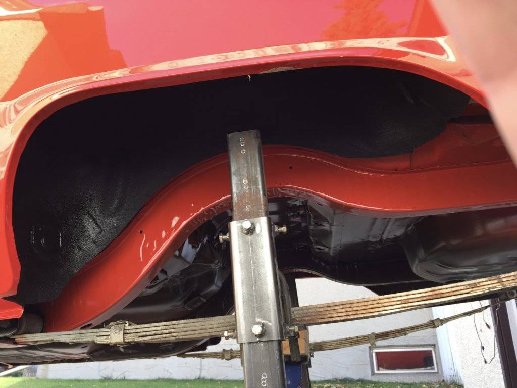 Needed to take advantage of the nice weather today since its supposed to go away probably until spring and get the undercoating on close to the way the factory guys put it on (not quite as sloppy) so got to work and masked it all up and gave it a scuff with red Scotchbrite. Then I got out the RestoRick's undercoating that matches the factory stuff really well and put a couple of coats on. It's been my experience that since undercoating and or rock guard left in a raw state attract road grime and dirt and it tends to imbed and permanently make the undercoating look dirty so it's best if the product you used is rubberized and paintable that you put a black paint or coating on top of it. In my case I have some black Epoxy that should work nicely and not be too shiny and will allow the undercoating to wash off much better then if it was raw,