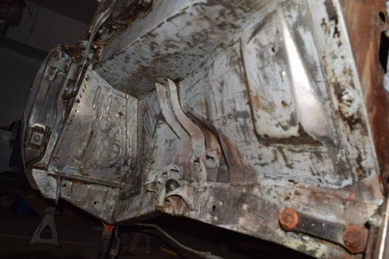 Jim question after a good cleaning do you think the stripper would work on undercarriage? I was also told Off heavy duty oven. What I will be working with attached.Gallon of Aircraft Stripper and a few hours with a the daughter and wire brushes we are getting closer to having the front clip completely stripped. This effort opens the door to weld in the left inner fender now (just setting in there right now)...