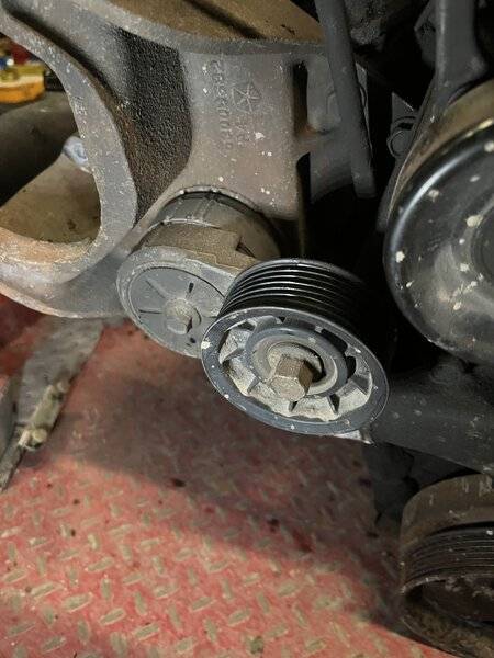 Here's a picture of the idler from earlier in the thread. The '91 part is the dirty one on the left, the other one is a '92+ Magnum tensioner.