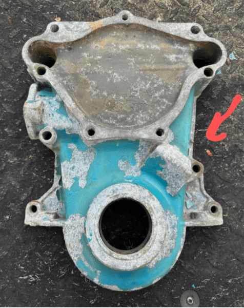 I believe the issue with the timing cover is the bolt hole ear is broken off and someone put a large head screw in to catch the edge of the timing cover and hold it tight