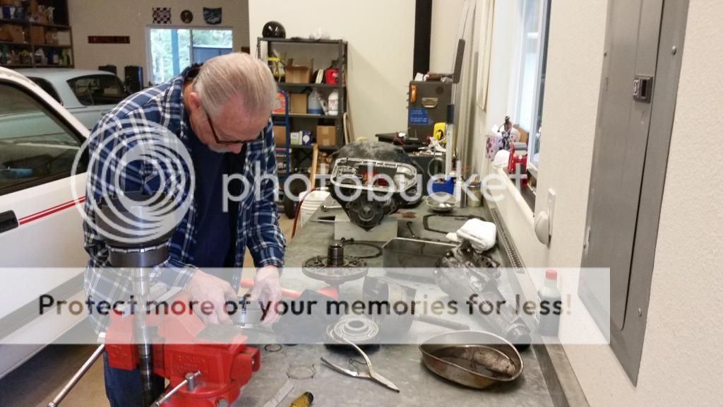 We disassembled the 904 this morning. This was my first look at the workings of an automatic transmission. Thank the lord for good customers. That is Rick. I built a fence and two automated gate systems for him. He is helping me(doing) the rebuild on the transmission. That is his Barracuda in the back ground.