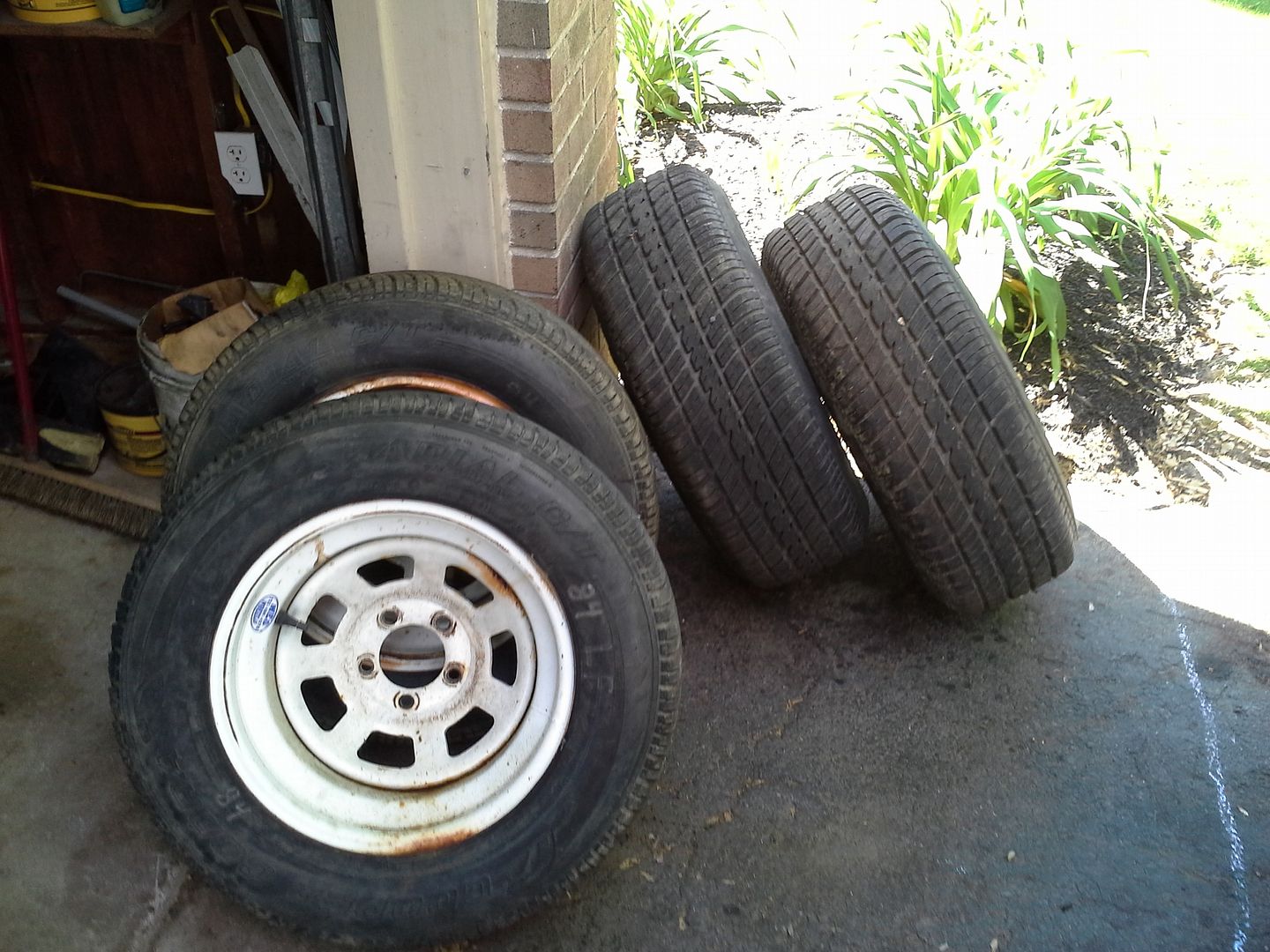 I have a set of (4) 15x8 white steel wheels that came off of a 73 Plymouth Duster . The wheels are made by Meg wheels in Belmar,NJ. (2) wheels are 3.5"backspacing the other (2) are 4.5" backspacing. Bolt pattern is 4.5"(fits Ford and Mopar) Wheels are in excellent shape except for some minor surface rust. Tires are Cooper Cobra Radials. They have 75-80% tread left. One tire has some rub marks from where the tire rubbed the fender. Tire size is (2) 225/70/15 and (2) 215/70/15. Asking $225 B/O or will separate tires from rims $125 for the tires $125 for the rims