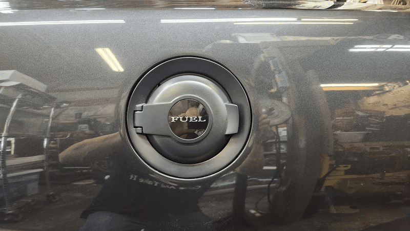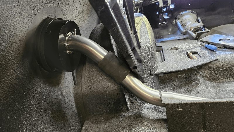 A small section of filler tube removed to correct the length and angle difference between the back of the Challenger door and the original flip-top cap locations. We will be adding a bracket to the lower section of the fill tube to secure it in place by attaching it to the adjacent wheelhouse bracket.