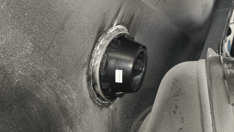 The flange of the original fuel filler is sandwiched between the "Can" and the fuel door housing.