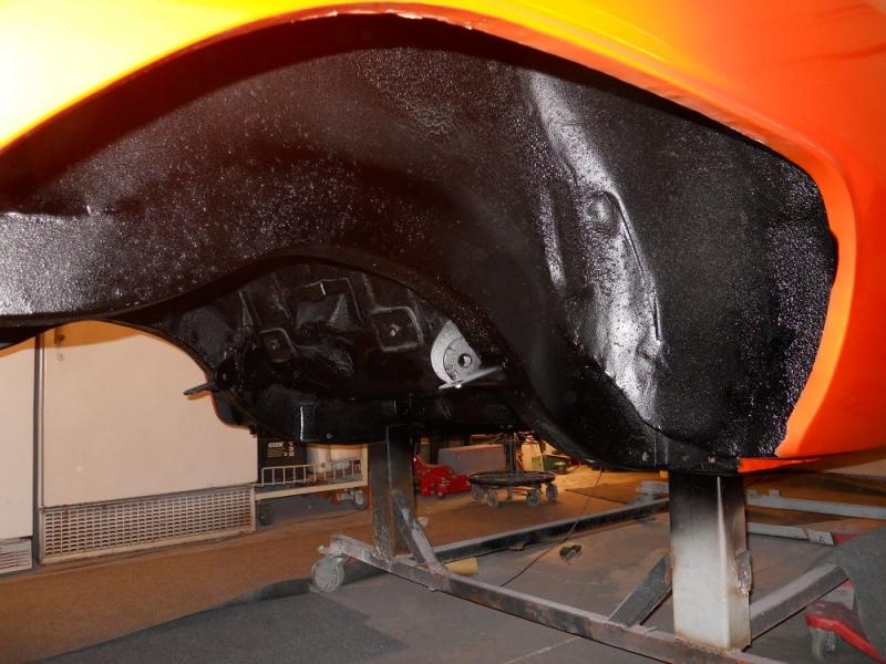 Here are some progress pics, the undercarriage turned out pretty damn good with the undercoating and satin black chassis paint. There is one pic of the engine bay that shows the "color shift" of the "Tangelo Pearl Orange" paint, just the viewing angle that the camera caught. One pic shows the steel ring that must be removed in rear crankshaft hole to fit the auto torque convertor. Back in Kansas for 2 weeks, can't wait to get back home and start on the wiring.