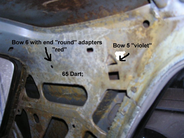 64 Valiant 2 dr. post: 5 Bows: #1-Brown, #2 Orange, #3Blue, #4 Pink, #5 Violet, and that one gets 6" springs tieing it back to the rear header.
