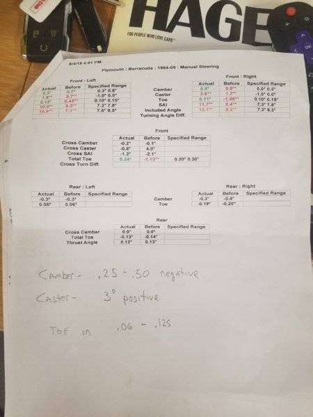 I have a 66 Formula S Barracuda, K-H front discs with the factory front sway bar and Bilstein shocks. Bushings are MOOG HD rubber, no offset bushings. I do not know the alignment specs. My guy road races, and I trust him. I do know he said, you cant get much more than +2.5 degrees caster and keep everything else where you need to. I also run the fastest rated tires I can get. Right now I'm running 195-55R15 V rated Dunlops all around. My brother has a 67 Fastback Barracuda with the Formula S suspension and 10 in front drum brakes. He would cruise at 100 mph all day out west, back in the day. Not sure what is going on with your car. Is everything torqued correctly?