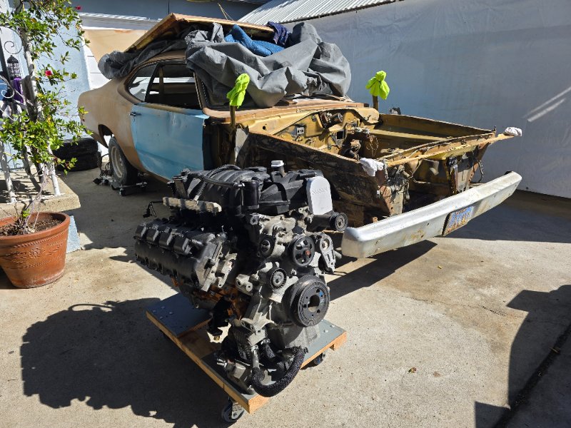 so swapped oil pans and test fit the motor today. didnt have the trans bolted up. man thats a tight fit. i dunno if its cause im using a 6 banger k member with the schumacher mounts or what but man i dunno what kinda headers are gonna fit besides the log style. i will be goin coil over up front so not gonna have the torsion bars. also i guess i need to do the runner flap thing delete cause that thing was not fitting with the wiper motor. unless theres a different wiper motor people swap to? besides that gotta start cutting up stuff now.
