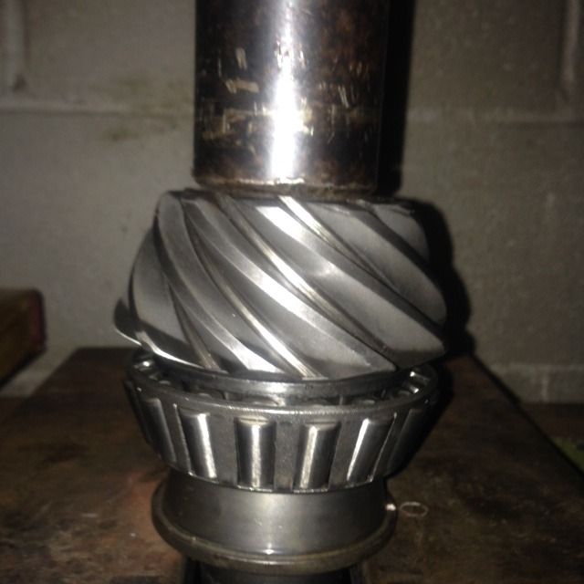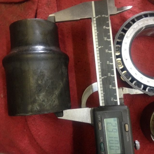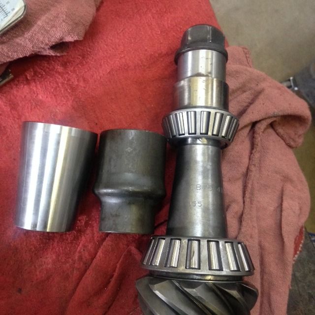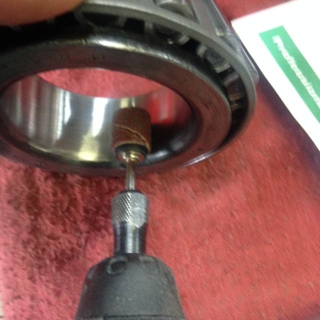 Made a set up bearing out of the old pinion bearing, Not shown I used a clamshell style bearing remover , which can remove bearings without damage. Using a Dremel with a sanding roll. Took just enough to allow it to slip on and off while I checked pinion gear depth;
