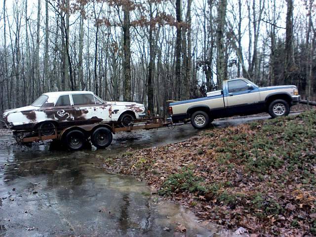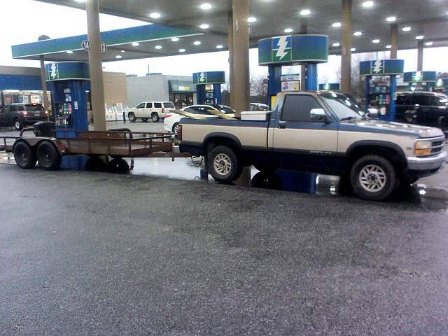 Thanks yall! Here it is in all its glory. First picture is us fillin up in Gray before we left. The second is after we had loaded and were heading back home. I thought we were going to need an ark before the day was over. Evan's 5.2 Dakota made an easy job of pullin the car. Thankful to have good friends.