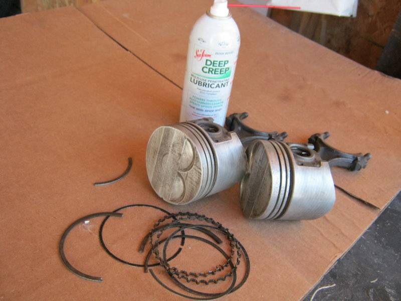 So here's how I got them out ....... with a Broom handle cut to length to use from inside on the side bosses of the piston and then for the top side I chiseled down a 4x4 block of wood ....shaped it for 3.63 bore and then shaped the wooden head of the block to the shape of the top of piston dome . so it would hit evenly across the piston . then Gave it a good wack and it moved. soaked it some more . wacked it back and forth until they all moved some . take them all out tomorrow .