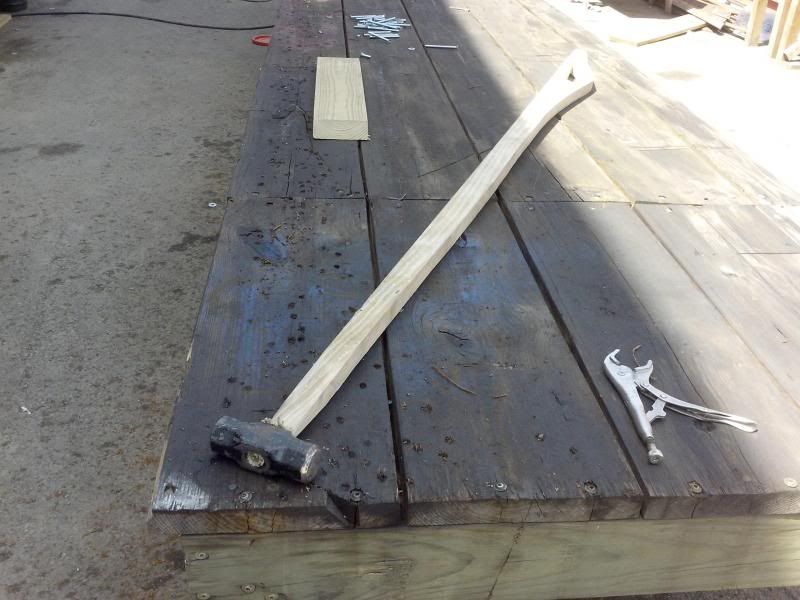That's the hammer in question with the vice grips to show size. I made it out of some 2x6 and an old sledge that fell apart in about 10 minutes just to finish up for the day.