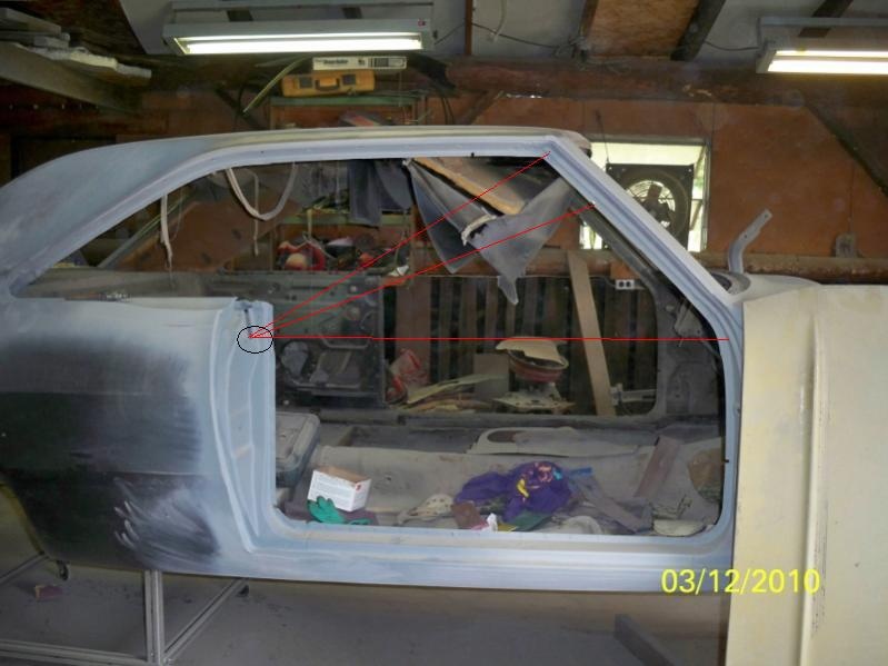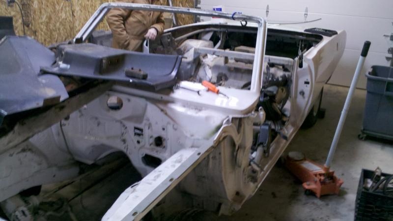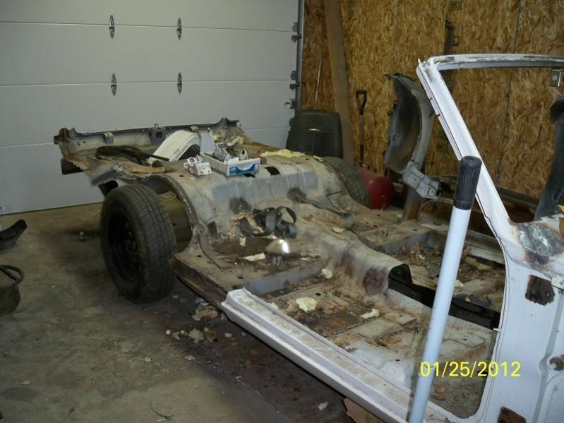 Here is the picture of the car that is going topless. I started cutting away at the conv. today I removed the right rear quarter panel trying to save it Dustin and myself didn't do too bad. Let me tell you there is a lot of a spot weld to remove to take it all apart. I think that I can take it all out in 1 piece but when the reinstall starts it will all have to come apart. I was just wondering anybody had any ideas how to measure the windshield frame before I remove it so when I install it to the same angle?