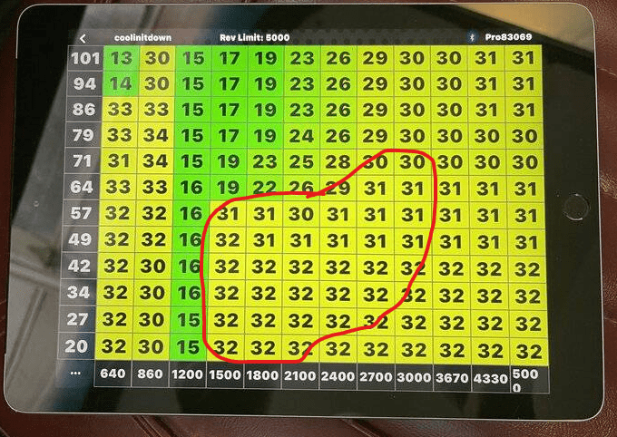 The area circled in red is where you might be in trouble. If you are trying to emulate a distributor w/o vacuum advance then the numbers should be nearly the same top to bottom. The jump from 19 to 31 at 1500 rpm between 57 and 64 kPa is pretty substantial. You may not spend much time in that cell, but if you get close to it in-between the computer will extrapolate a number somewhere between 19 and 31.