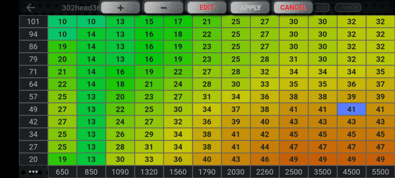 If I were you, I'd try changing the timing in the 1500 , 1800, and 2100 rpm columns to be the same at all kPa values from 64 on down.