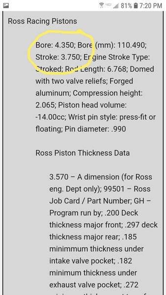 Bore: 4.350; Bore (mm): 110.490; Stroke: 3.750; Engine Stroke Type: Stroked; Rod Length: 6.768; Domed with two valve reliefs; Forged aluminum; Compression height: 2.065; Piston head volume: -14.00cc; Wrist pin style: press-fit or floating; Pin diameter: .990