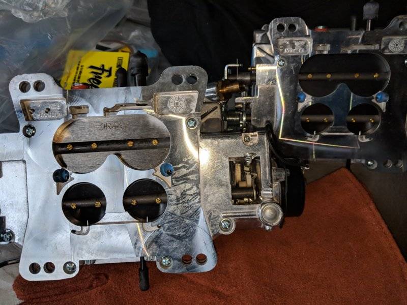 It looks like I can get a very short screwdriver in between them to adjust the rear carburetor if need be. I don't angle up like the Edelbrocks..