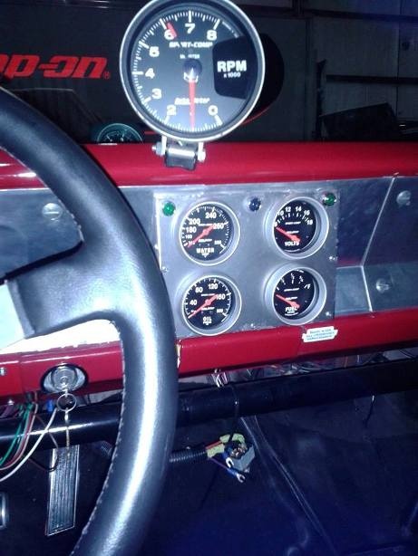 It has (from left to right) aftermarket Volts, Temp and Oil Pressure gauges then the Speedometer and I moved the fuel gauge to the far right where the idiot lights used to be.