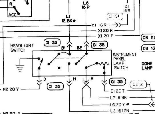 Far bottom right, E1-20T (tan) is dimmer controlled dash lamp power. This goes to the fuse panel, through the instrument fuse, and then turns to orange and feeds out to all dimmer controlled dash lamps