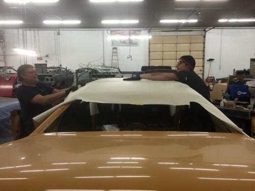 Paid a visit yesterday to my buddy's shop to deliver a few more parts and see if anymore progress has been done since the last time I was there. My ESPO leaf springs,axle and shocks were mounted. For some reason there were no shock mounts on the car and one of the previous owners must have different plans for the car. But they found some mounts and welded them in and all is good on that end. My painted steel rims were mounted on the tires and look awesome and can't wait to see them on the car The master cylinder and brake lines were on and fuel lines were there but not installed yet. In the short time I was there they were prepping the roof and getting ready to put the vinyl top on. I myself didn't take any picture's this time but did steal one off of his Facebook page of the vinyl top being installed.