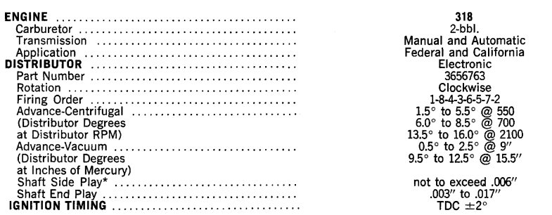 Notice the factory gave 4* leeway in the initial. This was to allow for different fuel, altitude and owner preferences. My folks had their '69 318 advanced a little and ran Premium until the gas crisis. 21 mpg on the highway. Pretty good at the time for a v-8 in a midsize car with an auto transmission and bias ply tires.
