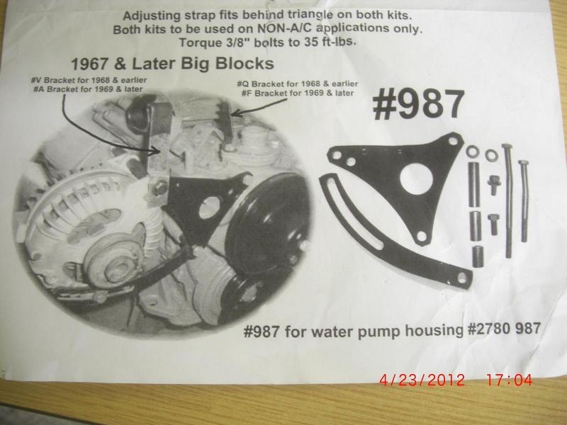 I am in need of some good pictures of the alternator brackets for my 71 383. I have some brackets off of my 440 but the ones that are on the engine are cobbled. I don't know if the brackets that I have will work. having a stupid moment!! I need pictures of a motor with no air of power steering! I will be running manual steering and no air. a single pulley set up! any help would be appreciated! It would be even better if some one has pics of engine on engine stand!! Thanks again, jared
