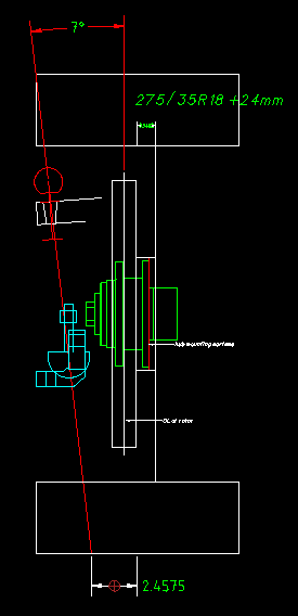 One of the things I looked at was scrub radius. The stock spindle appears to have about a 7 degree SAI and with my setup, I am getting about 2.45" of scrub radius. I think that could be better. Note that my custom upright results in the surface the wheel bolts to being in some compared to the stock spindle by maybe 3/8" or so. Changing the UBJ location and SAI to reduce the scrub radius would require shorter UCA's or the aftermarket adjustable ones. So that's up in the air, too.