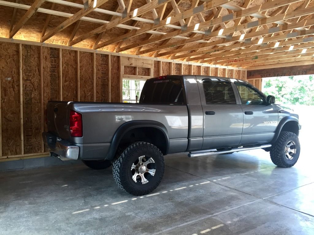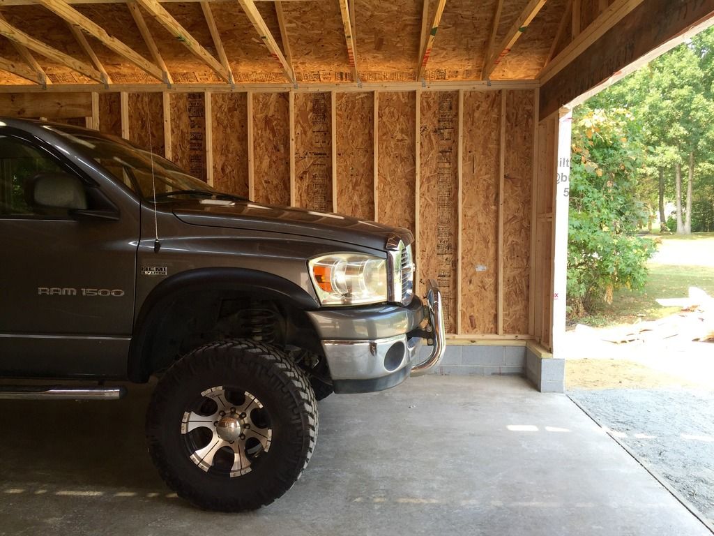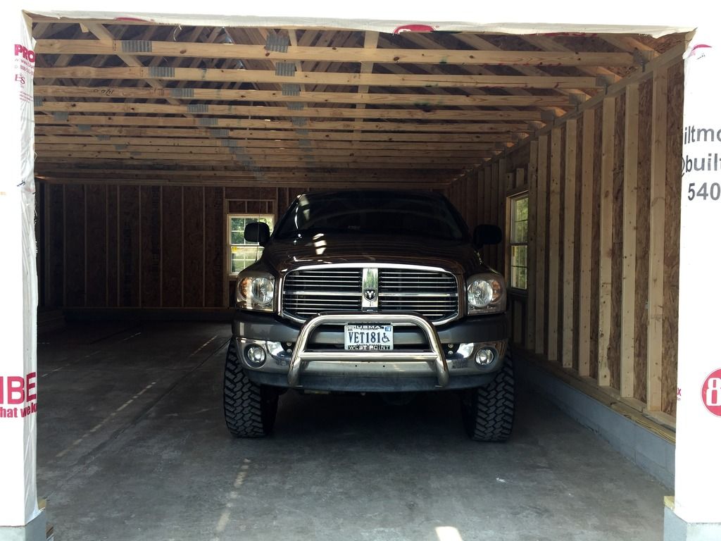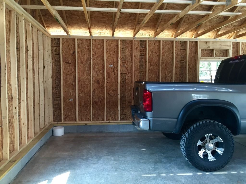 The inside is completely unfinished for now. I told my builder I wanted something that I could park my truck in (it is a rather large truck) and build a work bench behind it and still be able to walk around.