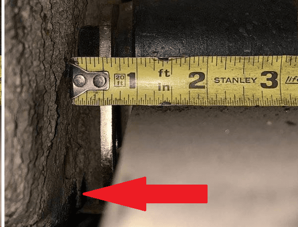 You can see that the top corner of the hanger is flush against the frame rail. There’s a small gap at the bottom because there’s a slight taper on the frame rail. And you can see that the edge of the spring is just over a 1/2” from the frame rail. That’s a rubber spring eye bushing, so there’s a bit of give there.
