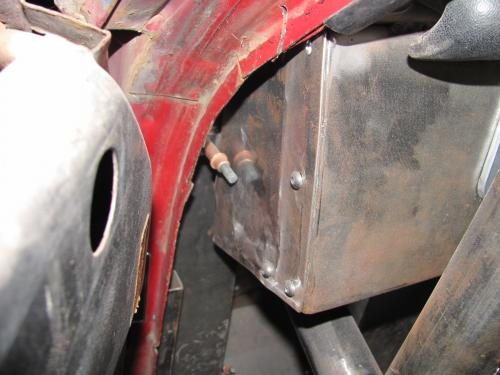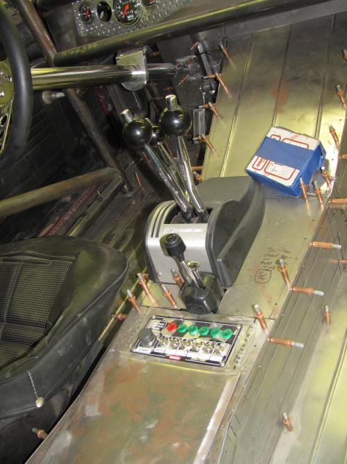Before doing the tin work I welded a 1/8 piece of plate in between the trans tubing to mount the shifter on. The shifter being used is an old school set of Hurst Lightning rods . Again Ebay at work , picked up just the shifter for $250.00 later found the plactic cover for $45.00 and then the back plate came up and I got it for $30.00 .. The shifter works real good with a reverse pattern manual valve body . Just grab a lever and pull the next gear .