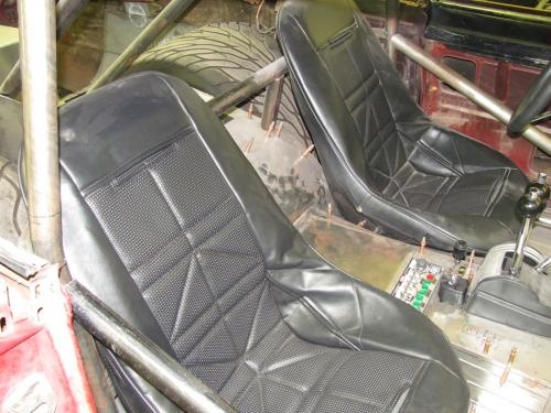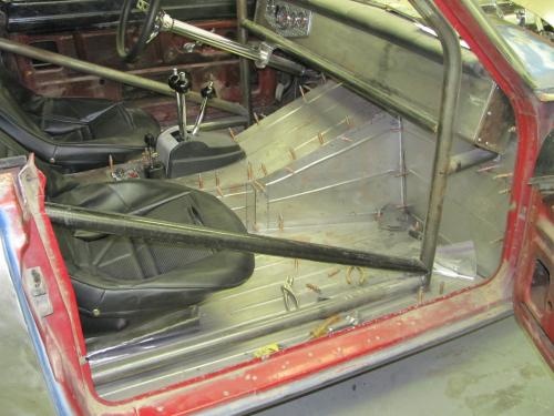 I used 1x1 18 guage tubing for the frame work for firewall and trans tunnel . It gives you strength so u can hang steering column support bearing and brake petal assembly on it . Wanted to use as much of the stock dash as possible but had to move it out about 2 inches on the face of it , Found a guage pod on Ebay from the DashMan , that would hold 5 guages , four 2 1/16 and one 3 1/2 . made a flat panel and set face of dash 2 inches by using scrap pieces of 2x3 tubing for spacers , and capped the end's creating a smoothe dash , wanted to use OEM dash pad and had to trim bottom edge until it would fit tight . I looked at getting it redone at Just Dashes but $400.00 was the quoted price , I found a plastic cap that would go on it for $100.00 so I will probably go that way . I used one on a friends Demon with good results . To keep with the old school theme I use plain chrome Auto Meter guages , They have a 3 1/2tac that has 8000 rpm on it , this is a 6000 rpm motor . NOTE : after installing roll cage had to modify the dash again , needed to remove it to work on sorting out wiper assemblys . with cage in place could not clear the ends . Did two things , cut end caps off and made removabe ones , I shortened the bottom of the dash a inch to start with but ended up cutting about 5 inches total off the bottom of it , only had about 1 inch of clearance with the firewall moved back .. The tin work was do inhouse my me . Made cardboard patterns and cut them out of 20 guage cold roll sheets . Rolled 1/4 beads on all the panels for keep noise down .