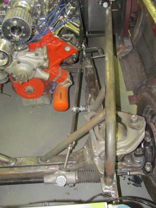 Pic's of engine fixture with ratchet straps to keep it from moving back , The oil pan hangs down a little to far in the pan pic's , changed out ft. tires out from 24 1/2 tall to 26 inch tall picked up 3/4 inch , will change out pan to shorter Milodon unit and will pick up about 1 1/2 . and can adjust coilover shocks and get 1 more inch .... just worried about speed bumps , almost 30 inches from c/l of ft. wheels to the oil pan , wheels go over but still have to clear the pan ....