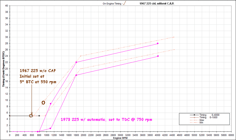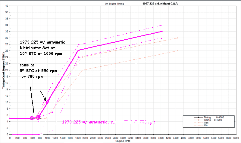For example: Using the 1967 225 w/o CAP distributor, measuring 10* at 900 rpm is the same as measuring 5* at 550 rpm.
