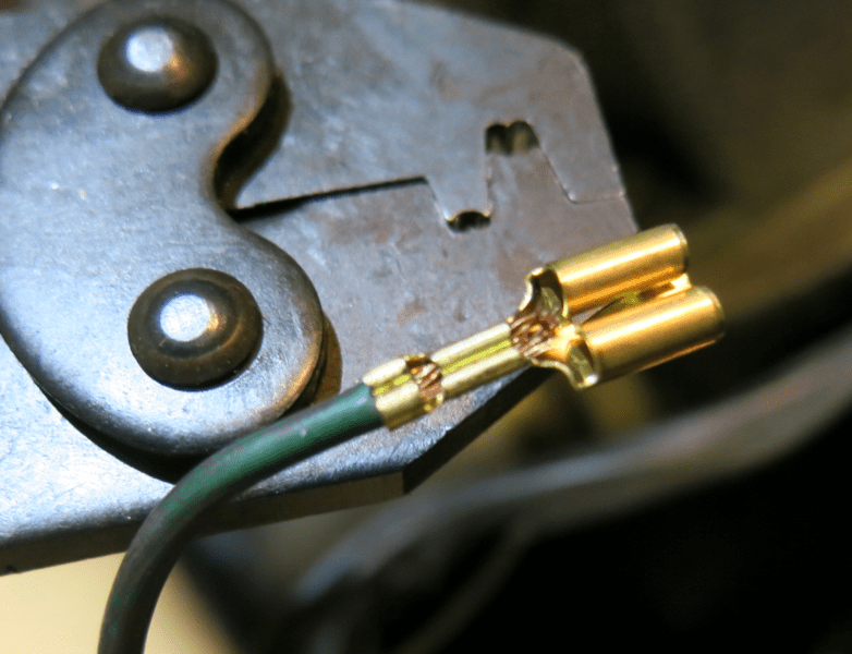 On the female terminals I got pretty good using the compound crimper. It's Astro brand. Had to experiment a bit to figure out which jaws match which terminal sizes best. It does both the wire and insulation crimps at the same time. On the male terminals the jaw is too wide. I was thinking of grinding it down but didn't. Ended up buying the replica Packard crimpers knowing I had more stuff ahead.