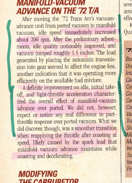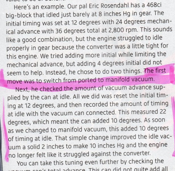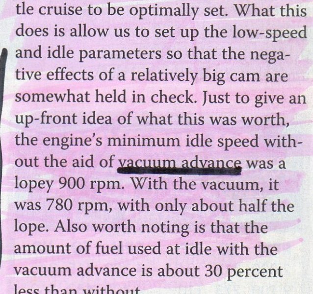 Below are some examples of what increasing idle timing did. Many used vac adv connected to manifold vac [ MVA ] to get the extra advance at idle. I doubt MVA would work with your combo because the vac is likely to low to pull in the plunger on the VA unit. The engine will not care where/how the extra timing comes from....as long as it gets it. Locked timing is one method.