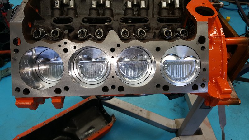 '74 360. +.030 bore, stock stroke, mid 90s high swirl LA heads, KB190 pistons, Hughes cam, Air Gap intake, Milodon Pro Touring pan. This same engine was in my drag car running high 12s in Denver with a TM6 and a much larger cam. I haven't tried it with the new intake and cam, but my cylinder pressure has increased with the swap, so I'm hopeful it may make even more power while idling smoother.