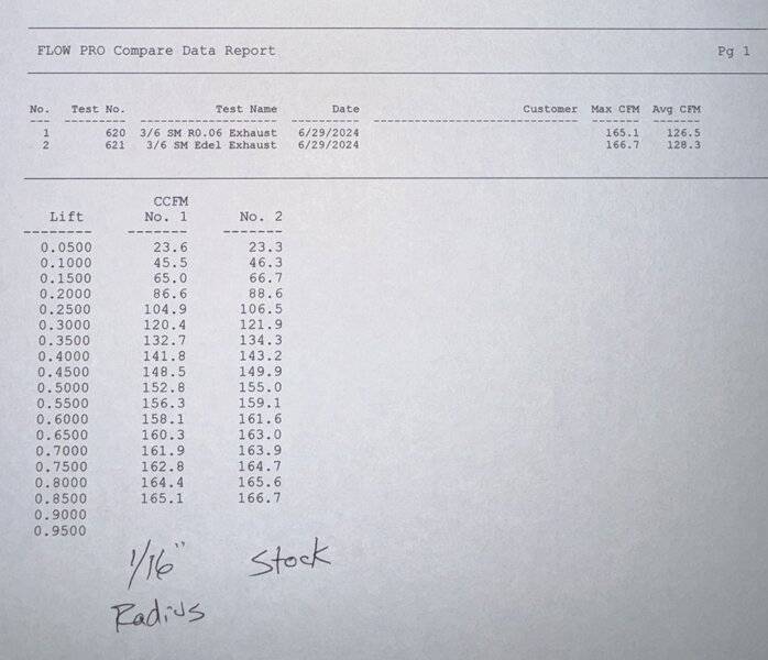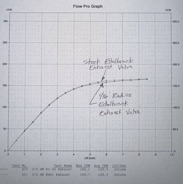 The chicken casserole is just going in the oven, so I had a few minutes to kill. Here you go @Yellow Duster. Tested the stock almost square corner 1.6" Edelbrock exhaust valve vs the Edelbrock exhaust valve with a 1/16" radius on the face. As often is the case, surprising results. I really thought the radius would help at low lifts and have no effect at high lift. I have no thoughts on an explanation for this.