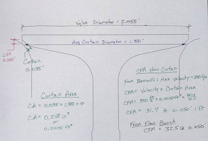 @273 this is especially for you since you like the math and have talked about the fact that flow at low lifts is always about the same on any head. Since the velocity is limited to 350 fps (or slightly higher due to the venturi effect) then cfm is totally dependent on curtain area. Curtain area is a function of valve seat angle(s) and valve diameter.