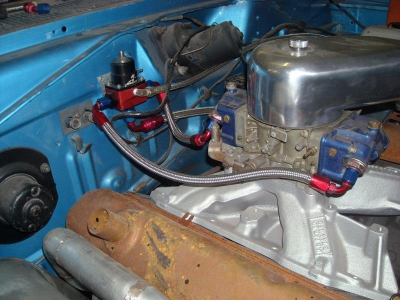 But my Falcon had the 1/2" Aluminum fuel line attached to the inside of the rail all the way to the regulator that was mounted to the right front rollbar over the suspension. Most every car that I have seen the line run along the inside of the rail. Now it was only the main line cause the inlet lines to the carb were on the normal right side then to the carb. Of course I did have a CSI trans shield around the glide and a JW bellhousing.