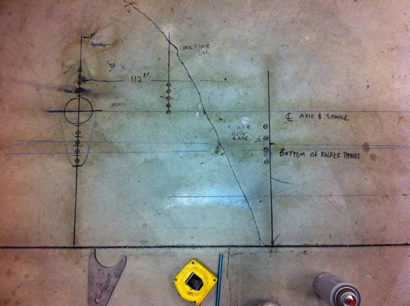 I made a little bit of progress today. I ended up pulling the 3rd Member and got it ready to ship out. All the measurements for the Brackets are done and I made some templates out of Chip Board. I bought a 18x18x1/4" Chromoly Plate that will get cut up to make the brackets. I did the Instant center calculations today also. The bottom bar will have 4 adjustment points Front and Rear. The top bar will have 3 adjustment points on top of the housing and 5 adjustment holes in the front. This will give me plenty of adjusting of Instant center from 18" off of the Rear tire to out past the front bumper in 6" or 12 " increments. The Instant center off the gound is adjustable from 5", 8", 12" etc up to 3' or so with all the combinations. My Initial set up will be about 1' back from the front tire either 5" or 8" off the ground and I will play with it from there.